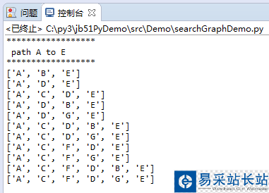 # -*- coding:utf-8 -*-#! python3def searchGraph(graph,start,end): results =[] generatePath(graph,[start],end,results) results.sort(key =lambda x:len(x)) return resultsdef generatePath(graph,path,end,results): state = path[-1] if state == end: results.append(path) else: for arc in graph[state]: if arc not in path: generatePath(graph,path +[arc],end ,results)if __name__ =='__main__': Graph={'A':['B','C','D'], 'B':['E'], 'C':['D','F'], 'D':['B','E','G'], 'E':[], 'F':['D','G'], 'G':['E']} r = searchGraph(Graph,'A','E') print("******************") print(' path A to E') print("******************") for i in r: print(i)三、運行結果