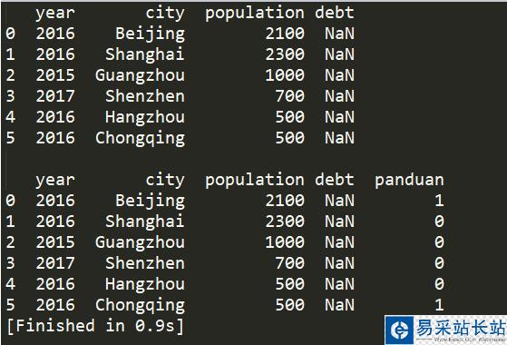 import numpy as np import pandas as pd data = {'city': ['Beijing', 'Shanghai', 'Guangzhou', 'Shenzhen', 'Hangzhou', 'Chongqing'], 'year': [2016,2016,2015,2017,2016, 2016], 'population': [2100, 2300, 1000, 700, 500, 500]} frame = pd.DataFrame(data, columns = ['year', 'city', 'population', 'debt']) print(frame, '/n') frame['panduan'] = frame.city.apply(lambda x: 1 if 'ing' in x else 0) print(frame) 運行結(jié)果如下: