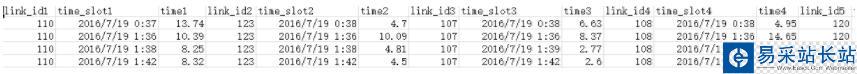 #建立表DF1=pd.DataFrame({'link_id1':col1,'time_slot1':col2,'time1':col3,'link_id2':col4,'time_slot2':col5,'time2':col6,'link_id3':col7,'time_slot3':col8,'time3':col9,'link_id4':col10,'time_slot4':col11,'time4':col12,'link_id5':col13,'time_slot5':col14,'time5':col15,'link_id6':col16,'time_slot6':col17,'time6':col18,'all_time':col19})#重新排列index的值DF2=DF1.reset_index(drop=True)#按照指定的列排序columnsDF=DF2.reindex(columns=['link_id1','time_slot1','time1','link_id2','time_slot2','time2','link_id3','time_slot3','time3','link_id4','time_slot4','time4','link_id5','time_slot5','time5','link_id6','time_slot6','time6','all_time'])#保存成csv格式的文檔DF.to_csv('A_2.csv')結(jié)果: