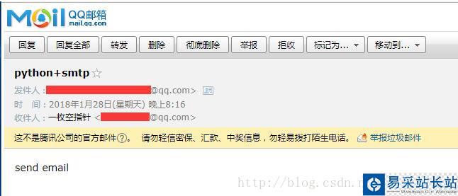 from smtplib import SMTP_SSL from email.mime.text import MIMEText from email.header import Header email_from = "123456@qq.com" #改為自己的發送郵箱 email_to = "654321@qq.com" #接收郵箱 hostname = "smtp.qq.com" #不變,QQ郵箱的smtp服務器地址 login = "123456@qq.com" #發送郵箱的用戶名 password = "xddflpwqesfkbidf" #發送郵箱的密碼,即開啟smtp服務得到的授權碼。注:不是QQ密碼。 subject = "python+smtp" #郵件主題 text = "send email" #郵件正文內容 smtp = SMTP_SSL(hostname)#SMTP_SSL默認使用465端口 smtp.login(login, password) msg = MIMEText(text, "plain", "utf-8") msg["Subject"] = Header(subject, "utf-8") msg["from"] = email_from msg["to"] = email_to smtp.sendmail(email_from, email_to, msg.as_string()) smtp.quit()