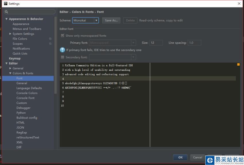 在font中scheme選擇monokai,但是并不能進行更改,比如字體大小,如果要進行進一步地調整,選擇save as,這樣就可以在這個新的備份上進行修改了