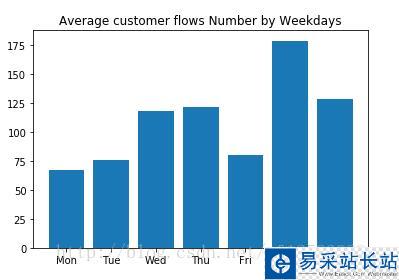 import matplotlib.pyplot as pltimport numpy as np#val_ls = [np.random.randint(100) + i*20 for i in range(7)]scale_ls = range(7)index_ls = ['Mon','Tue','Wed','Thu','Fri','Sat','Sun']plt.bar(scale_ls, val_ls)#_ = plt.xticks(scale_ls,index_ls) ## 可以設置坐標字plt.title('Average customer flows Number by Weekdays')以上這篇python matplotlib繪圖,修改坐標軸刻度為文字的實例就是小編分享給大家的全部內容了,希望能給大家一個參考,也希望大家多多支持武林站長站。