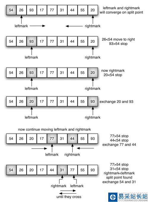其中,劃分元素的 選取 直接影響到快速排序算法的效率,通常選擇列表的第一個(gè)元素或者中間元素或者最后一個(gè)元素作為劃分元素,當(dāng)然也有更復(fù)雜的選擇方式;劃分 過(guò)程根據(jù)劃分元素重排列表,是快速排序算法的關(guān)鍵所在,該過(guò)程的原理示意圖如下:
