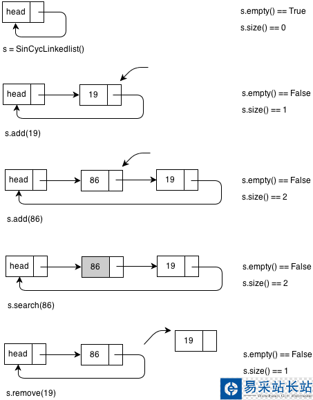 #!/usr/bin/env python# -*- coding: utf-8 -*-class Node: def __init__(self, initdata): self.__data = initdata self.__next = None def getData(self): return self.__data def getNext(self): return self.__next def setData(self, newdata): self.__data = newdata def setNext(self, newnext): self.__next = newnextclass SinCycLinkedlist: def __init__(self): self.head = Node(None) self.head.setNext(self.head) def add(self, item): temp = Node(item) temp.setNext(self.head.getNext()) self.head.setNext(temp) def remove(self, item): prev = self.head while prev.getNext() != self.head: cur = prev.getNext() if cur.getData() == item: prev.setNext(cur.getNext()) prev = prev.getNext() def search(self, item): cur = self.head.getNext() while cur != self.head: if cur.getData() == item: return True cur = cur.getNext() return False def empty(self): return self.head.getNext() == self.head def size(self): count = 0 cur = self.head.getNext() while cur != self.head: count += 1 cur = cur.getNext() return countif __name__ == '__main__': s = SinCycLinkedlist() print('s.empty() == %s, s.size() == %s' % (s.empty(), s.size())) s.add(19) s.add(86) print('s.empty() == %s, s.size() == %s' % (s.empty(), s.size())) print('86 is%s in s' % ('' if s.search(86) else ' not',)) print('4 is%s in s' % ('' if s.search(4) else ' not',)) print('s.empty() == %s, s.size() == %s' % (s.empty(), s.size())) s.remove(19) print('s.empty() == %s, s.size() == %s' % (s.empty(), s.size()))
