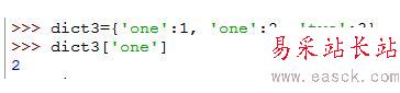 即在字典中,有至少兩個成員的鍵相同,但是鍵對應(yīng)的值是不同的,格式如下: