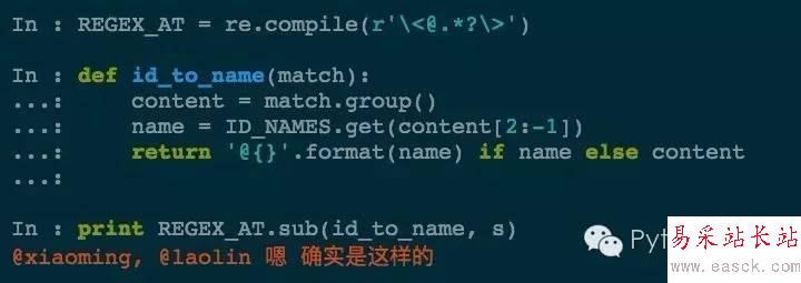 在解析對應(yīng)關(guān)系之后,還希望吧尖括號也去掉,替換后的結(jié)果是「@xiaoming, @laolin 嗯 確實是這樣的 」