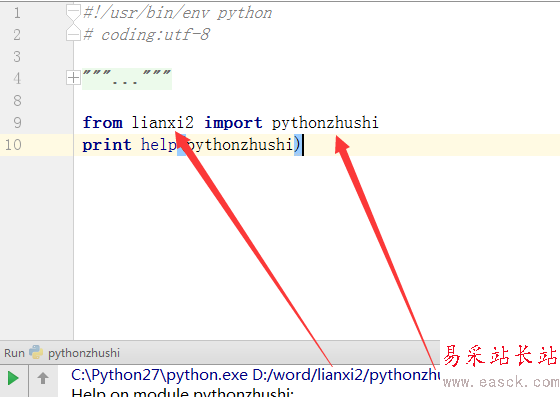這里要強調(diào)說明下py的名字要和你當前工作的py名字一樣(我這里創(chuàng)建的py名字就是pythonzhushi,最后導入也是這名字),因為下面的測試中import的導入的是自身所以,im port 名稱 和Help(名稱)以及你的文件名稱要一致才可以。為了更加直觀請看下面這圖: