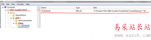 Step2:在HKEY_CLASSES_ROOT/*/shell (或者HKEY_LOCAL_MACHINE/SOFTWARE/Classes/*/shell ,兩個目錄是一樣的) 添加一個key:YNote,然后在該項中新建項command,然后再編輯字符串,添加應用程序的路徑,最后再路徑和名稱的后面加上空格和“%1”,然后在右鍵就可以找到YNote的打開方式