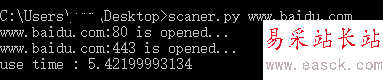 #coding=utf-8import socketimport timeimport sysimport structimport threadingfrom threading import Thread,activeCountresults=[]def portScanner(ip,port): server = (ip,port) sockfd = socket.socket(socket.AF_INET,socket.SOCK_STREAM) sockfd.settimeout(0.1) #設置阻塞模式下socket的超時時間 ret = sockfd.connect_ex(server) #成功返回0,失敗返回error的值。 if not ret: sockfd.close() results.append([ip,port]) #print '%s:%s is opened...' % (ip,port) else: sockfd.close() pass return '' def ip2num(ip): #將ip地址轉換成數字 lp = [int(x) for x in ip.split('.')] return lp[0] << 24 | lp[1] << 16 | lp[2] << 8 |lp[3]def num2ip(num): ip = ['','','',''] ip[3] = (num & 0xff) ip[2] = (num & 0xff00) >> 8 ip[1] = (num & 0xff0000) >> 16 ip[0] = (num & 0xff000000) >> 24 return '%s.%s.%s.%s' % (ip[0],ip[1],ip[2],ip[3])def iprange(ip1,ip2): num1 =socket.ntohl(struct.unpack("I",socket.inet_aton(str(ip1)))[0]) num2 =socket.ntohl(struct.unpack("I",socket.inet_aton(str(ip2)))[0]) tmp = num2 - num1 if tmp < 0: return None else: return num1,num2,tmpif __name__ == '__main__': if((len(sys.argv)!= 4)&(len(sys.argv)!= 2)): #用法說明 print 'Usage:/n/tscanner.py startip endip port' print '/tscanner.py ip' sys.exit() if len(sys.argv)==4: #對某一IP段的掃描 time_start=time.time() #起始時間 startip = sys.argv[1] #起始IP endip = sys.argv[2] #結束IP port = int(sys.argv[3]) #端口號 res = iprange(startip,endip) if not res: print 'endip must be bigger than startone' sys.exit() elif res[2] == 0: portScanner(startip,port) else: for x in xrange(int(res[2])+1): #IP地址依次遞增 startipnum = ip2num(startip) startipnum = startipnum + x if activeCount() <=1000: Thread(target=portScanner,args=(num2ip(startipnum),port)).start() print "There are %d hosts." %len(results) results.sort() for ip,port in results: print "%s:%d is opened..." %(ip,port) times=time.time()-time_start #用時 print 'use time : %s' % times if len(sys.argv)==2: time_start=time.time() port=0 ip=sys.argv[1] while(port<2000): if activeCount() <= 40: #設置40線程掃描 Thread(target = portScanner, args = (ip, port)).start() port=port+1 results.sort() for ip,port in results: print "%s:%d is opened..." %(ip,port) times=time.time()-time_start print 'use time : %s' % times
