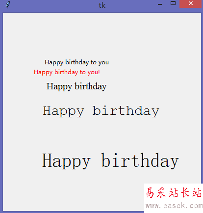 >>> canvas.create_text(150,150,text='Happy birthday',font=('Times',15))>>> canvas.create_text(200,200,text='Happy birthday',font=('Courier',22))>>> canvas.create_text(220,300,text='Happy birthday',font=('Couried',30))