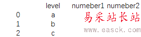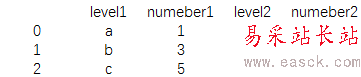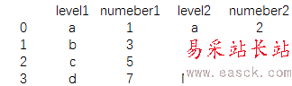 import numpy as npimport pandas as pddata1 = pd.DataFrame({'level':['a','b','c','d'], 'numeber':[1,3,5,7]})data2=pd.DataFrame({'level':['a','b','c','e'], 'numeber':[2,3,6,10]})print(data1)