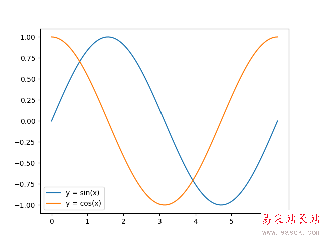 import numpy as npimport matplotlib.pyplot as pltx = np.linspace(0, 2 * np.pi, 100)y1, y2 = np.sin(x), np.cos(x)plt.plot(x, y1, label='y = sin(x)')plt.plot(x, y2, label='y = cos(x)')plt.legend()plt.show()
