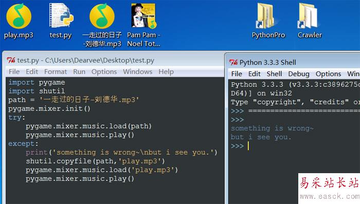 import pygameimport shutilpath = '一走過的日子-劉德華.mp3'pygame.mixer.init()try: pygame.mixer.music.load(path) pygame.mixer.music.play()except: print('something is wrong~/nbut i see you.') shutil.copyfile(path,'play.mp3') pygame.mixer.music.load('play.mp3') pygame.mixer.music.play()