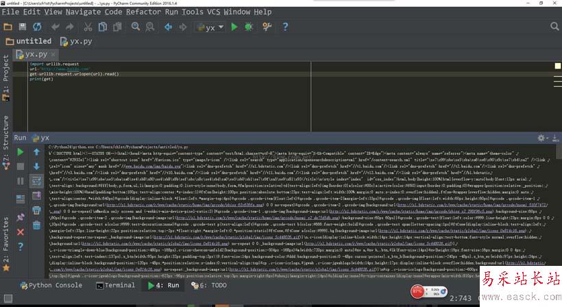 import urllib.request url="http://www.baidu.com" get=urllib.request.urlopen(url).read() print(get)