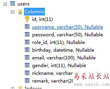 class User(db.Model): __tablename__="users" id=db.Column(db.Integer,primary_key=True) username=db.Column(db.String(50),unique=True,index=True) password=db.Column(db.String(50)) nickname=db.Column(db.String(50)) email=db.Column(db.String(100)) birthday=db.Column(db.DateTime) gender=db.Column(db.Integer) remark=db.Column(db.String(200)) role_id=db.Column(db.Integer,db.ForeignKey("roles.id"))