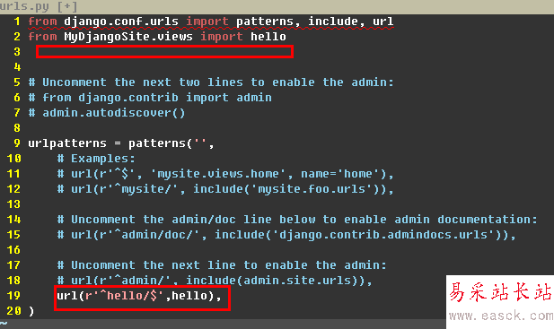 我們為urlpatterns加上一行: (r‘^hello/$', hello), 這行被稱作URLpattern,它是一個Python的元組。元組中第一個元素是模式匹配字符串(正則表達式);第二個元素是那個模式將使用的視圖函數。