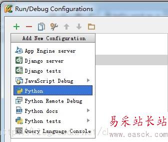 點擊綠色的加號,新建一個配置項,并選擇python。(因為hello word 就是個python程序)