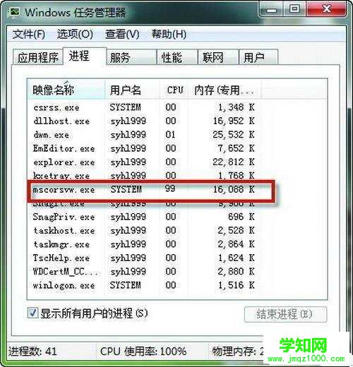 1、如下圖,用ctrl+shift+esc組合鍵打開任務管理器,就會發現這個Mscorsvw.exe進程占用了大量的cpu資源