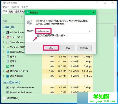 2、在打開的任務管理器窗口,點擊【文件】,在下拉菜單中點擊【運行新任務(N)】,輸入:Explorer.exe,點擊【以系統管理權限創建此任務】打勾,再點擊:確定,此時系統桌面圖標應該已經恢復。