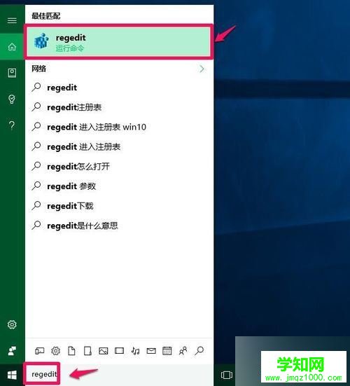 1、在桌面左下角的搜索欄中輸入regedit命令,點擊【regedit運行命令】,打開系統注冊表編輯器;