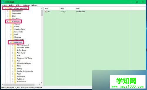 2、在打開的注冊表編輯器窗口,依次展開:HKEY_Local_MACHINE/Software/Microsoft;