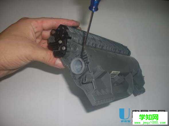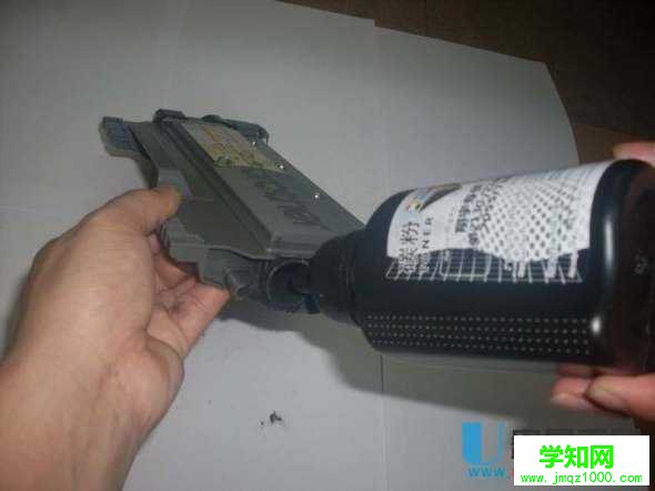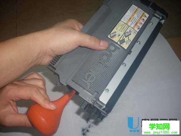 第三步:倒出粉盒里剩余碳粉,用吹氣球清理干凈粉盒,盡可能沒有殘留,否則打印可能會(huì)有重影。