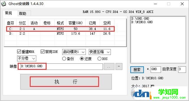 3、選擇列表中的系統盤(默認C盤),選擇“WIN10.GHO”或是Win7.GHO映像文件,點擊執行。會提示是否重啟,點擊是,系統將自動安裝。整個安裝過程持續10到15分鐘,一切無需人工干預,請耐心等待。