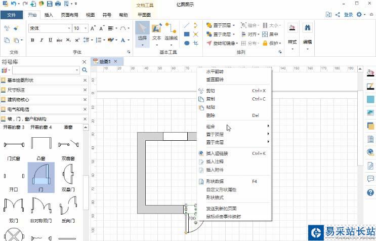 4、設置開門方向,可以右擊門的形狀在右鍵菜單中選擇垂直翻轉或者水平翻轉按鈕進行設置。拖拽黃色的控制點改變門的朝向角度和方向。