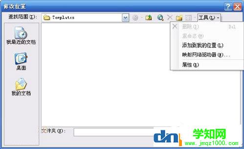 3、在“修改位置”對話框中其實打開的就是模板所在文件夾,只不過在這里要修改的是文件夾,無法對模板文件進行操作,即便如此,仍有辦法。單擊對話框右上方的“工具”,然后從彈出菜單中選擇“屬性”命令;