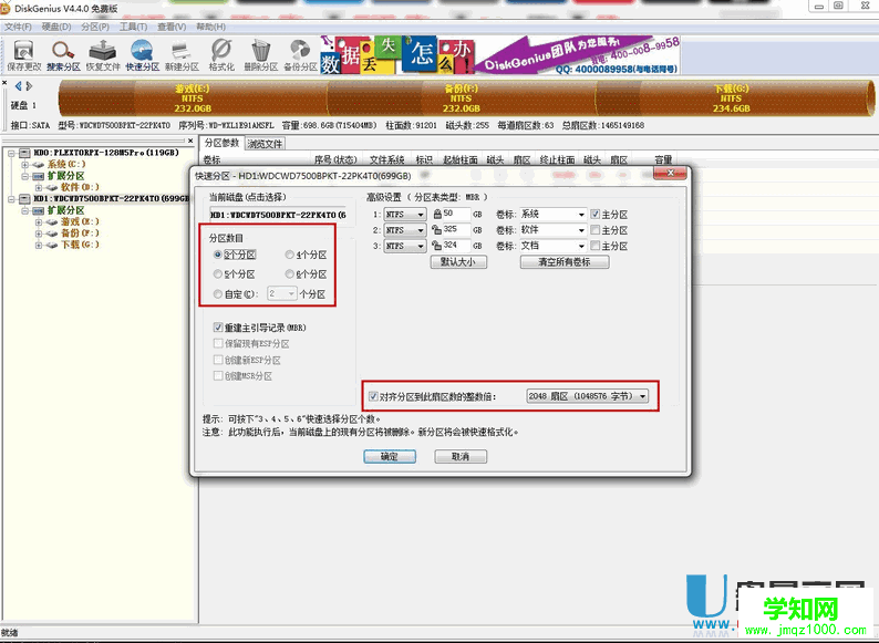 按F6彈出快速分區的界面,在左側選擇好需要分區的數目,在右側調整好各個分區的大小,大多數硬盤都是支持高級格式化的,所以下面建議大家勾選 對齊到2048扇區 ,以做到4K對齊(如果筆記本安裝了固態硬盤必須勾選此個項目,否則造成SSD性能損失)