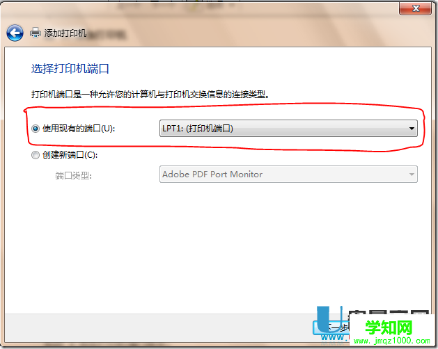 5、在 選擇打印機端口 窗口中,選擇 使用現有的端口 ,然后在下拉菜單中,選擇默認端口 LPT1:(打印機端口) ,然后點擊 下一步 按鈕。如下圖所示: