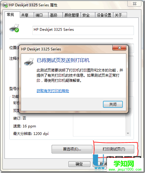 14、切換到 常規 選項卡,點擊 打印測試頁 按鈕,進行打印測試,如果打印成功,則添加已成功。