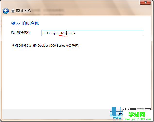 7、在 鍵入打印機名稱 窗口中,在 打印機名稱: 文本框中,鍵入打印機名稱,然后點擊 下一步 按鈕。如下圖所示:
