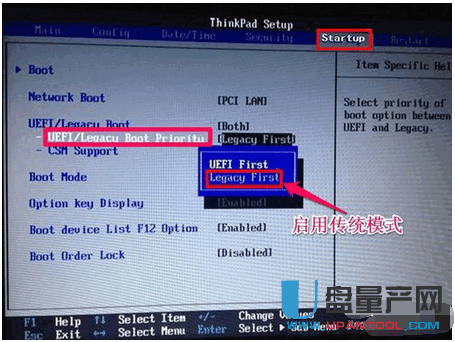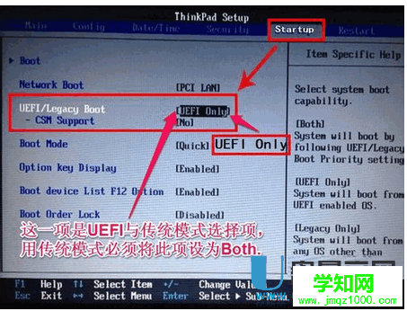 然后再選擇Startup(啟動項)這一項,先在里面選擇UEFI/Legacy Boot這一項,其中文之意是 新式UEFI與傳統啟動方法 ,現在里面顯示的是 UEFI Only(單一UEFI模式) ,我們要選擇兼容模式,也就是要兼容傳統BIOS模式,所以按Enter進入,選擇Both這項,按Enter確定。