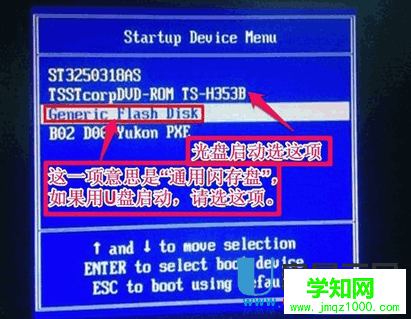 注意:有的聯想筆記本可能顯示的快捷啟動菜單不一樣,可能里面顯示的U盤不是U盤的名稱,而為USB-HDD,這個同樣是U盤,這里面還顯示了光驅項,如果要用系統光盤啟動電腦,可選擇光驅這一項。