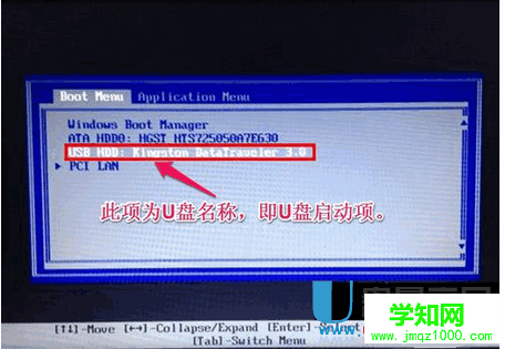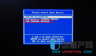 反復按F12鍵后,進入啟動菜單界面,在啟動菜單界面,將光標移動到圖中紅框選中的項,然后按Enter鍵確定,這樣就進入U盤了。