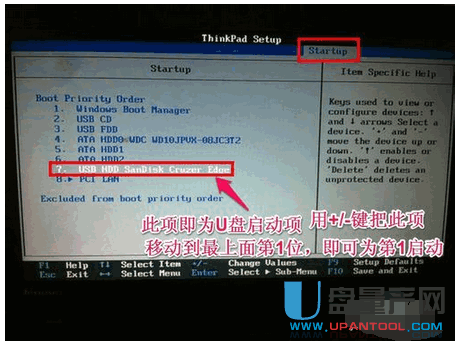 進入啟動選項界面后,選擇USB HDD SanDisk Cruzer Edge這一項,這個即為U盤啟動項,先把光標移到這一項來,然后用+/-鍵,把這一項移動到最上面,讓它排在第1位,這樣,它就是第一啟動項了,按Enter鍵確定。