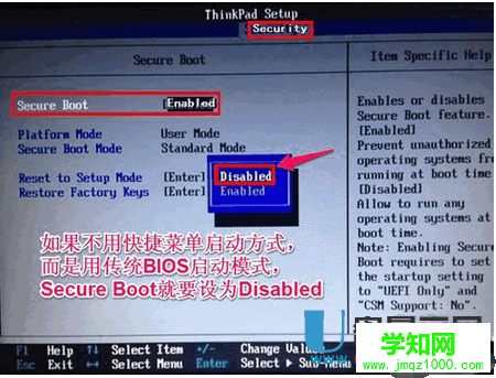 進入到下一頁后,選擇其中的Secure Boot這一項,按Enter打開小窗口,選擇Disabled(關閉)這一項,再按Enter確定。