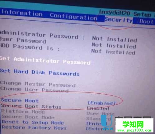 2、找到security 選項(xiàng),如下圖,可以看到security boot是enabled狀態(tài),這樣就會出現(xiàn)啟動不了。