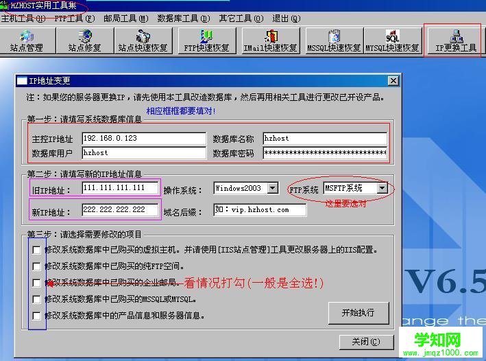2.更改hzhost主數(shù)據(jù)庫(kù)里的ip- 華眾控制器- html' target='_blank'>虛擬主機(jī)實(shí)用工具- IP更換工具- 填寫(xiě)好主數(shù)據(jù)庫(kù)信息(不知道密碼的,可以在主站下查看X:hzhosthzhost_masterincsconstr.asp)