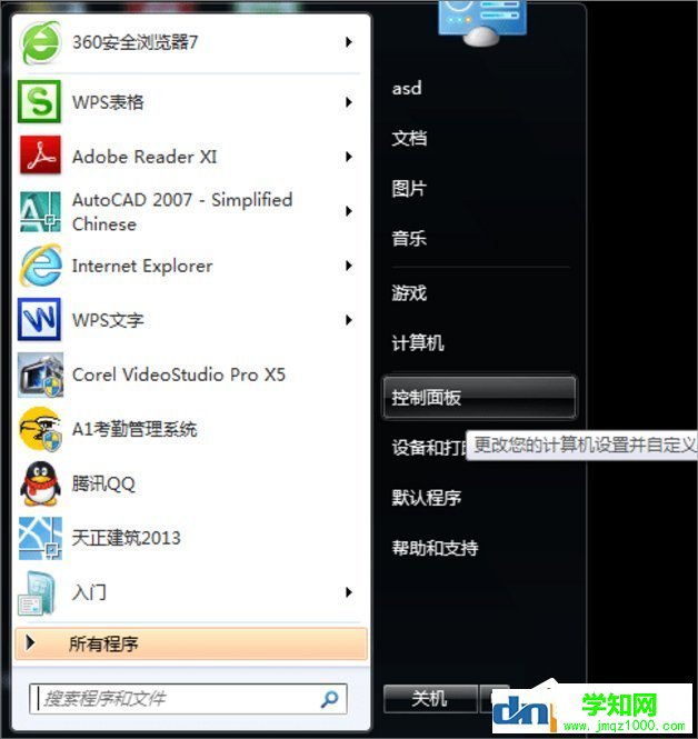 1、還是和XP一樣,點擊“開始”,在右側有一個“控制面板”按鈕。