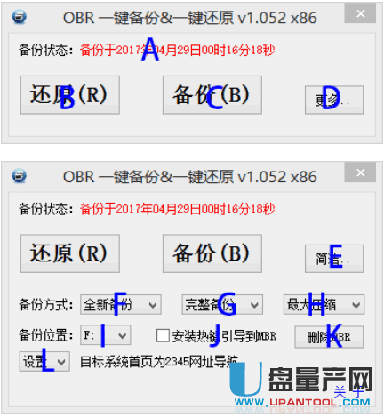 B、還原:無備份是顯示為灰色不可用狀態,若已經備份,該按鈕可用,點擊準備完畢后重啟開始