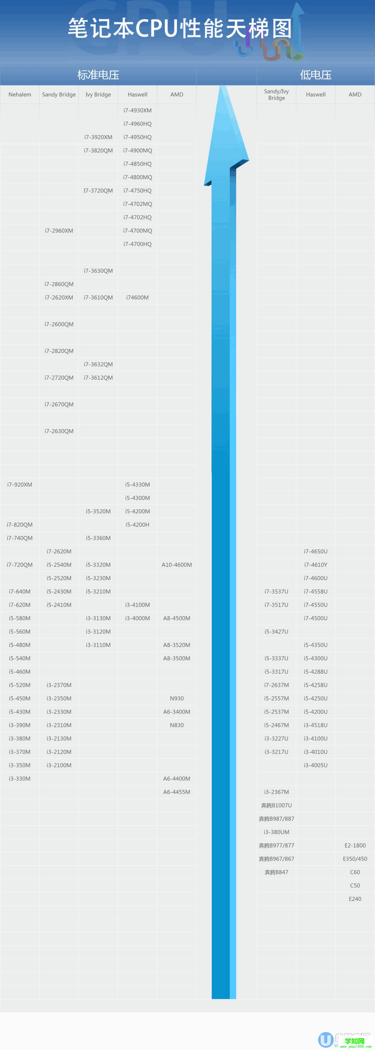 筆記本CPU天梯圖是綜合每款CPU的性能跑分按跑分的高低做排序的一張圖表,能在一定程度上反應CPU的性能優劣。下面就是詳細的筆記本cpu天梯圖。