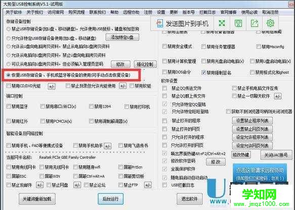從打開的程序主界面中,勾選 恢復USB存儲設備、手機或藍牙等設備的使用 項,此時將自動恢復所有USB接口的正常使用功能。