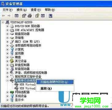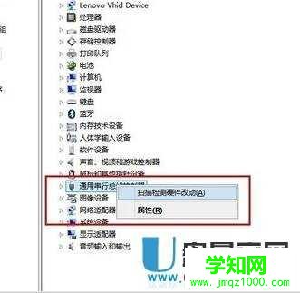 右鍵點擊 通用串行總線控制器 項目,在彈出的下拉菜單中選擇 掃描檢查硬件改動 。