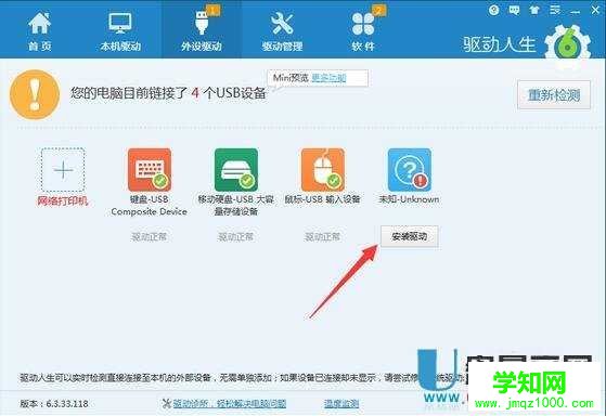接著切換到 外設驅動 選項卡,從 USB設備 列表中就可以找到當前無法被電腦正常識別的USB設備,直接點擊 安裝驅動 按鈕。