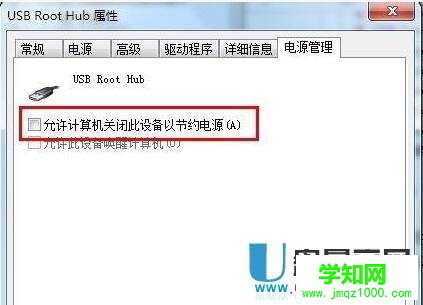 在打開的也窗口中點擊 電源管理 選項卡,去掉 允許計算機關閉此設備以節約電源 ,點擊 確定 按鈕(依次對每個USB Root Hub的屬性進行修改)。