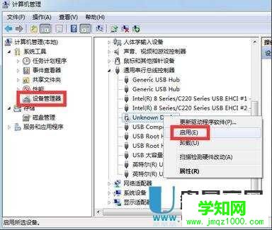 從打開的 計算機管理 窗口中,展開 設備管理器 項,在右側展開 通用串行總線控制器 列表,從中找到被禁用的USB設備,右擊選擇 啟用 項即可。
