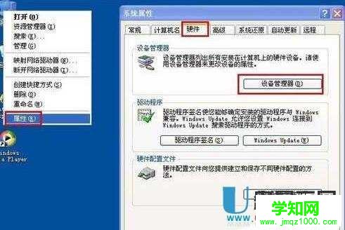 將筆記本重啟,點擊 開始 菜單,打開 運行 ,輸入 devmgmt.msc 命令,點擊 確定 按鈕或者右擊桌面上 我的電腦 ,在彈出的快捷菜單中選擇 屬性 ,點擊 硬件 選項卡,然后點擊下面的 設備管理器 按鈕。