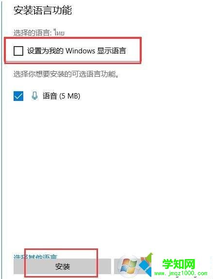 7、按需要選擇是否設置為windows 語言(這里根據大家需要吧,如果不想把系統語言也設置為泰語那么就不要勾選了),小編這里取消了勾選。點擊安裝按鈕;